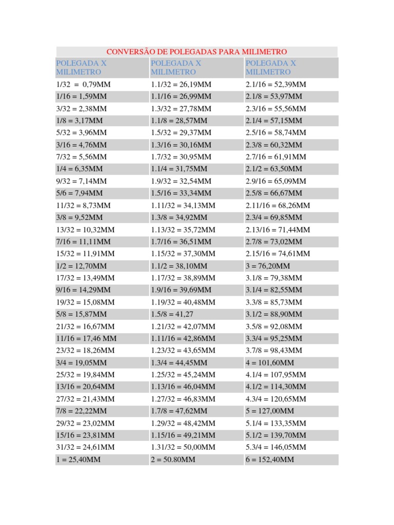 Encontre nessa tabela de Conversão de Polegadas e Milímetros uma lista das polegadas em que os fixadores são fabricados e suas respectivas medida em mm. Facebook; Instagram; Pinterest; LinkedIn;. 11/16 = 17,46 MM: 1.11/16 = 42,86MM: 3.3/4 = 95,25MM: 23/32 = 18,26MM: 1.23/32 = 43,65MM: 3.7/8 = 98,43MM: 3/4 = 19,05MM: 1.3/4 = 44,45MM: 4.