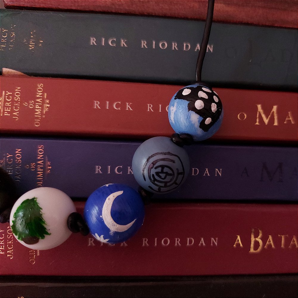 Descrição do produto. Colar de contas de madeira, feitos à mão! Produto 100% artesanal. O colar foi inspirado nos livros do autor Rick Riordan, no universo de Percy Jackson. Cada conta representa um ano que ele passou no Acampamento Meio-Sangue desde o primeiro livro "Percy Jackson e o Ladrão de Raios" até o livro "Percy Jackson e o.
