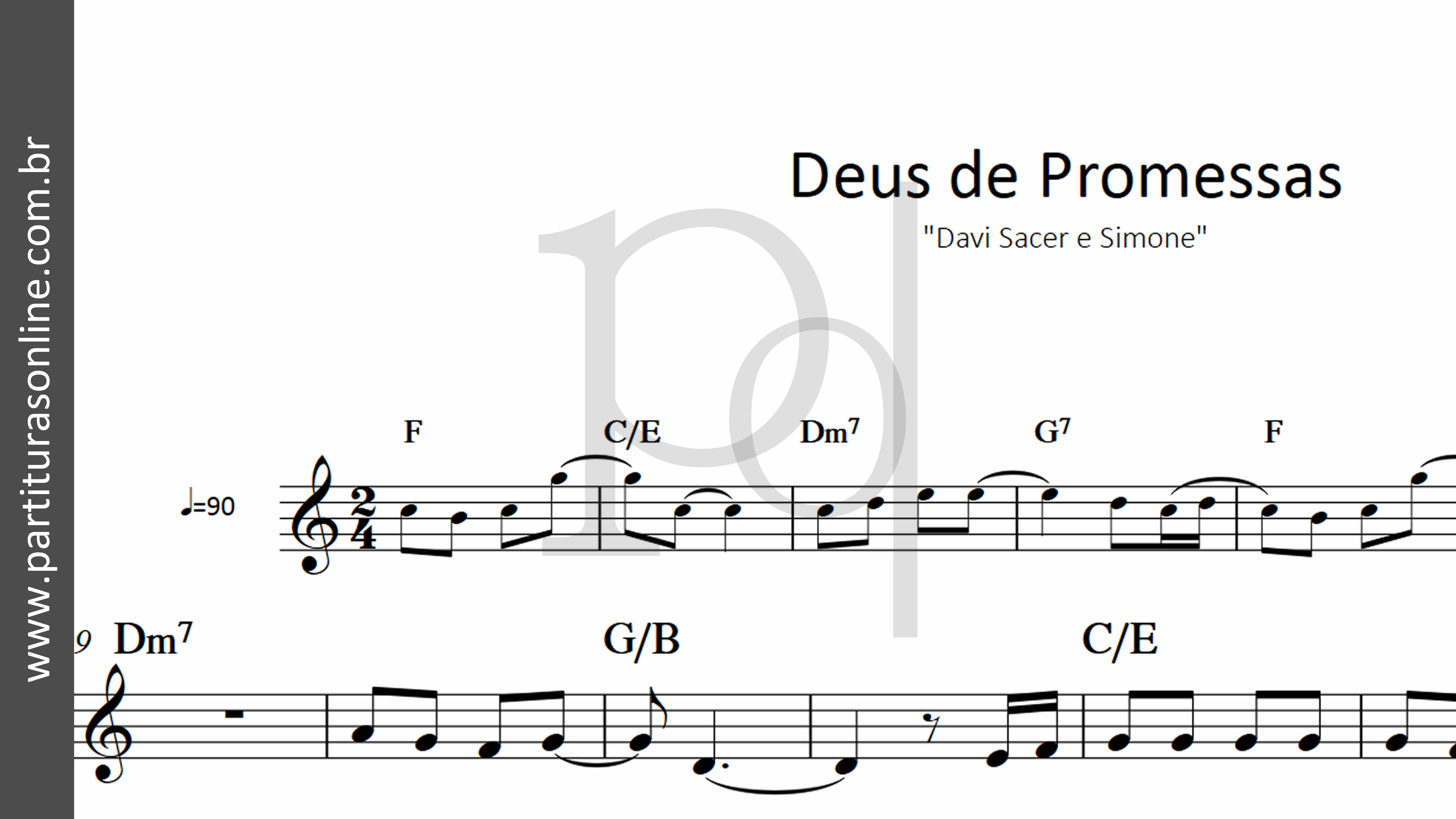 Simone Mendes) Deus de Promessas (part. Simone Mendes) Davi Sacer. Cifra: Principal (violão e guitarra) Favoritar Cifra. Tom: C. [Intro] F C/E Dm7 G F C/E Dm7 G . [Primeira Parte] Dm7 G/B . Sei que os Teus olhos. C/E F C/E . Sempre atentos permanecem em mim. Dm7 G/B . E os Teus ouvidos. C/E F . Estão sensíveis para ouvir meu clamor. C/E Dm7 G/B .