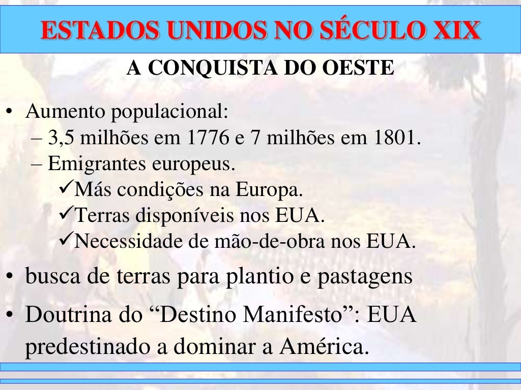 EUA no séc XIX. 1- Formação territorial. Destino manifesto. predestinação divina: calvinistas. ocupar esse território. tudo que acontece aqui: está justificado pela essa ideia de destino. marcha para o Oeste. objetivos: expansão da agropecuária.