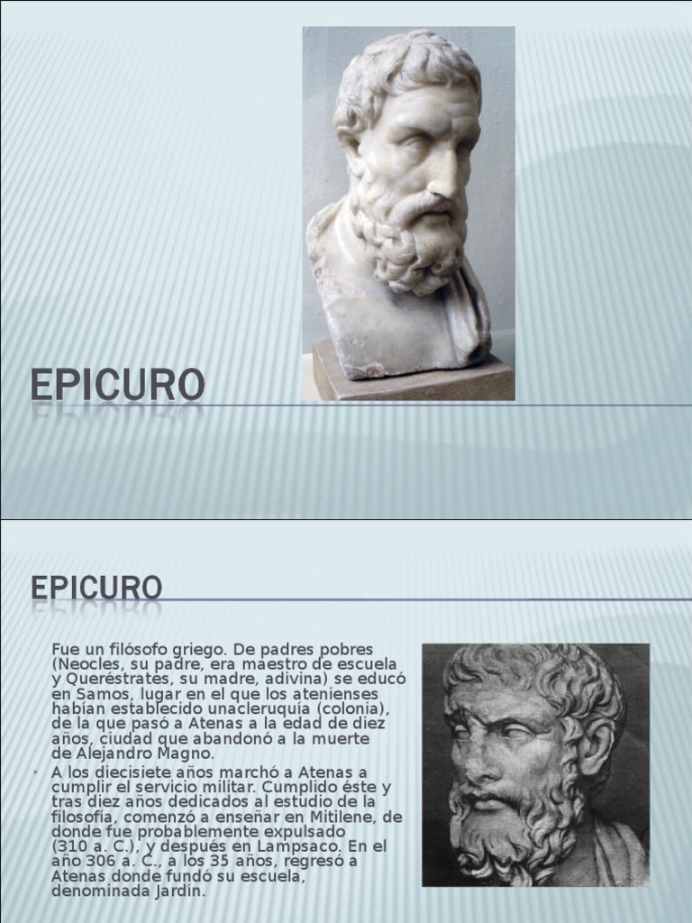 Para Epicuro, os homens possuíam três tipos de desejos: desejos naturais e necessários; desejos naturais, mas não necessários; desejos não naturais e não necessários; Epicuro e a forma de ser feliz. Epicuro foi um filósofo grego do Período Helenístico.