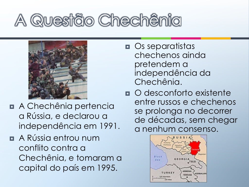 Os movimentos separatistas no Cáucaso, no território russo, têm como protagonistas os chechenos, que lutam pela sua própria constituição territorial. Ouça o texto abaixo! A Rússia é um.