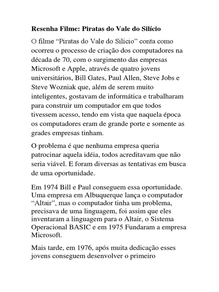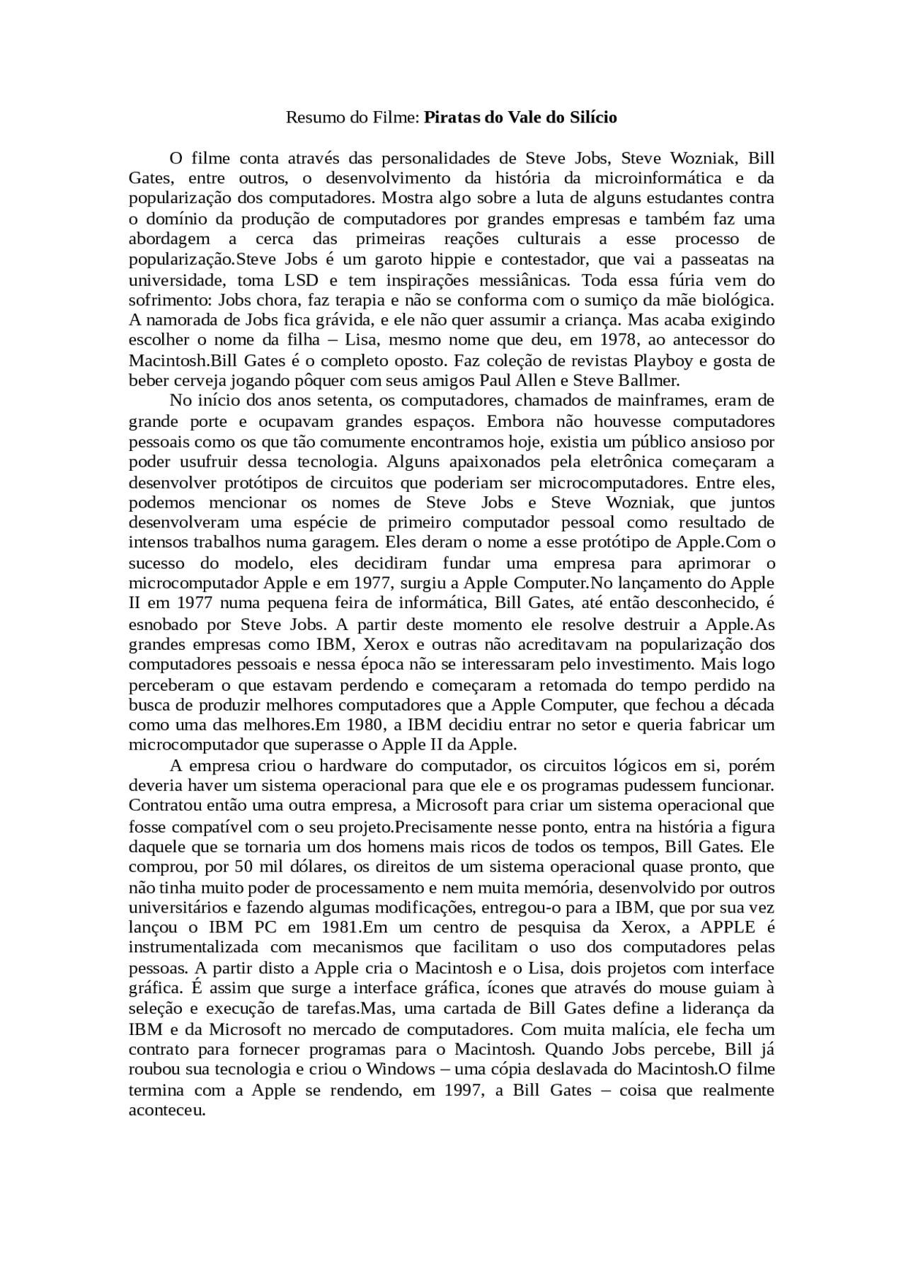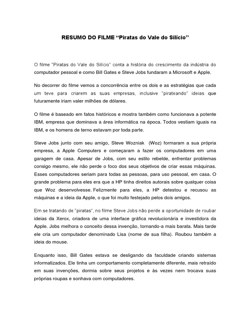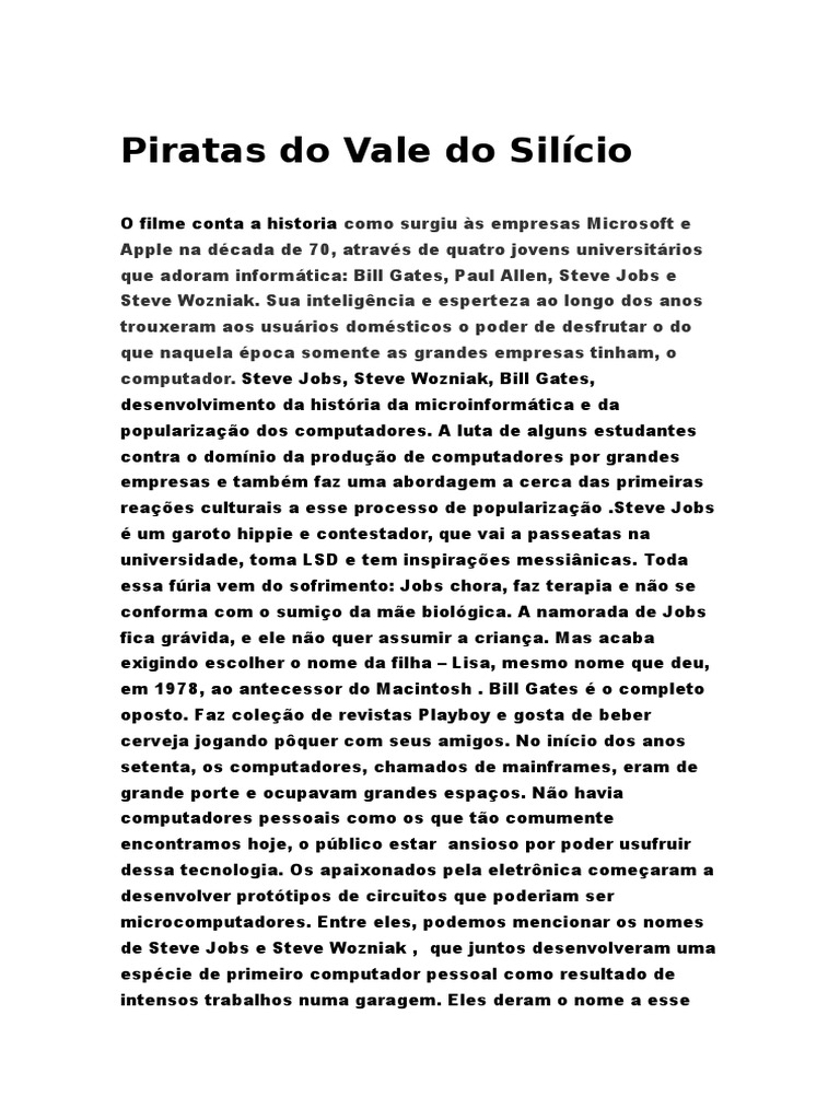 Resenha: Resumo do filme " Piratas do Vale do Silício". Pesquise 860.000+ trabalhos acadêmicos. O filme fala sobre como surgiu às empresas Microsoft e Apple na década de 70, através de quatro jovens universitários que adoram informática: Bill Gates, Paul Allen, Steve Jobs e Steve Wozniak. Com toda inteligência e esperteza ao longo.