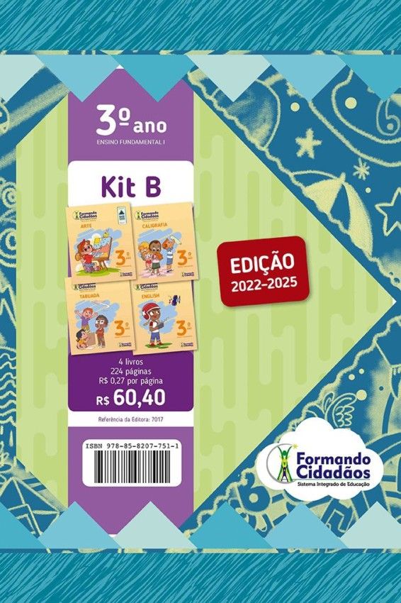 Formando Cidadãos 3º Ano Kit A. CONTÉM: 1 Língua Portuguesa. 4 livros de literatura: A Copa do Mundo no Mar; A Patativa e a Margarida; O Natal de Chico em Macacopolia; Que Brinquedo é Esse? 1 Matemática. 1 História. 1 Geografia. 1 Ciências. 1 Cidadania Moral e Ética. 1 Diário do Aluno. Formando Cidadãos 3º Ano Kit B. CONTÉM: 1 Caligrafia. 1 Artes.