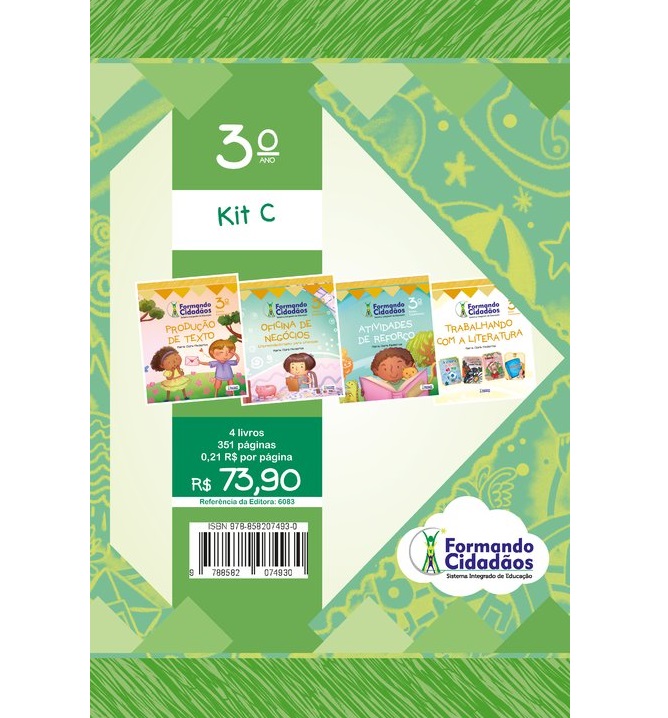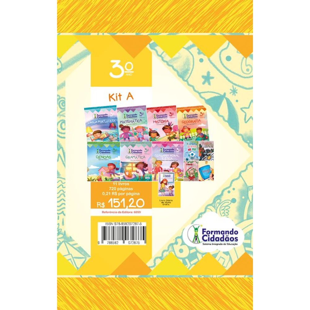 Descrição. Formando Cidadãos 3º Ano Kit A voltado para o ensino fundamental 1 contém: 1 Língua Portuguesa 4 livros de literatura: A Copa do Mundo no Mar A Patativa e a Margarida; O Natal de Chico em Macacopolia; Que Brinquedo é Esse? 1 Matemática 1História 1 Geografia 1 Ciências1 Cidadania Moral e Ética 1 Diário do Aluno. Características.
