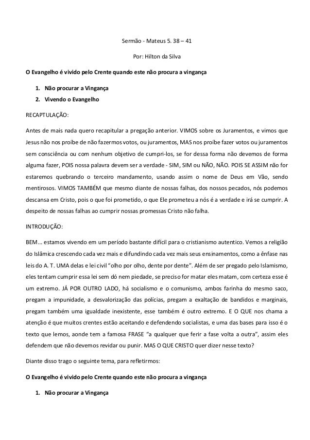 A Vingança (). 38 "Vocês ouviram o que foi dito: 'Olho por olho e dente por dente' []. 39 Mas eu lhes digo: Não resistam ao perverso. Se alguém o ferir na face direita, ofereça-lhe também a outra. 40 E se alguém quiser processá-lo e tirar-lhe a túnica, deixe que leve também a capa. 41 Se alguém o forçar a caminhar com ele uma milha [], vá com ele duas.