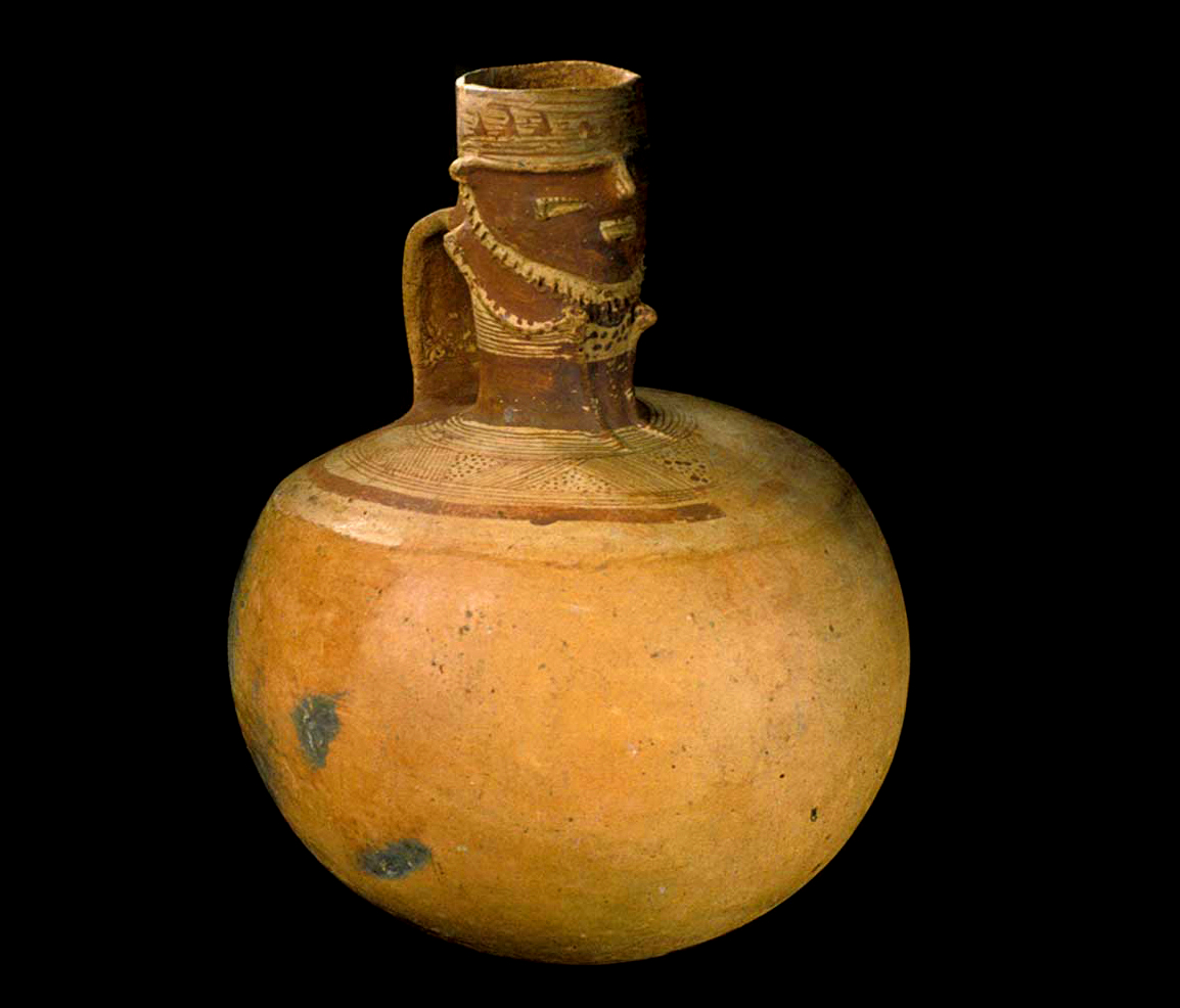 Múcura. Una múcura es un recipiente de barro arcilloso de la familia de los cántaros, similar a la botija, de tamaño mediano, con largo y estrecho cuello y pie esferóide como en las ollas. Nota 1 Vasija precolombina usada para recoger, beber y almacenar agua, chicha, cereales. Simbólicamente es una representación de lo femenino, más.