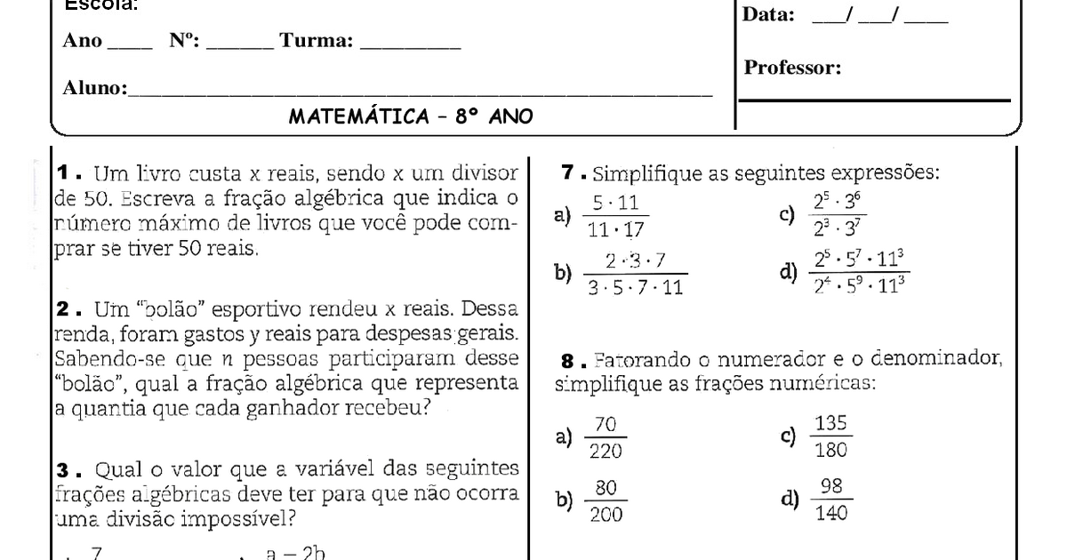 Atividades de Matemática 8º ano questões objetivas Escola Educação