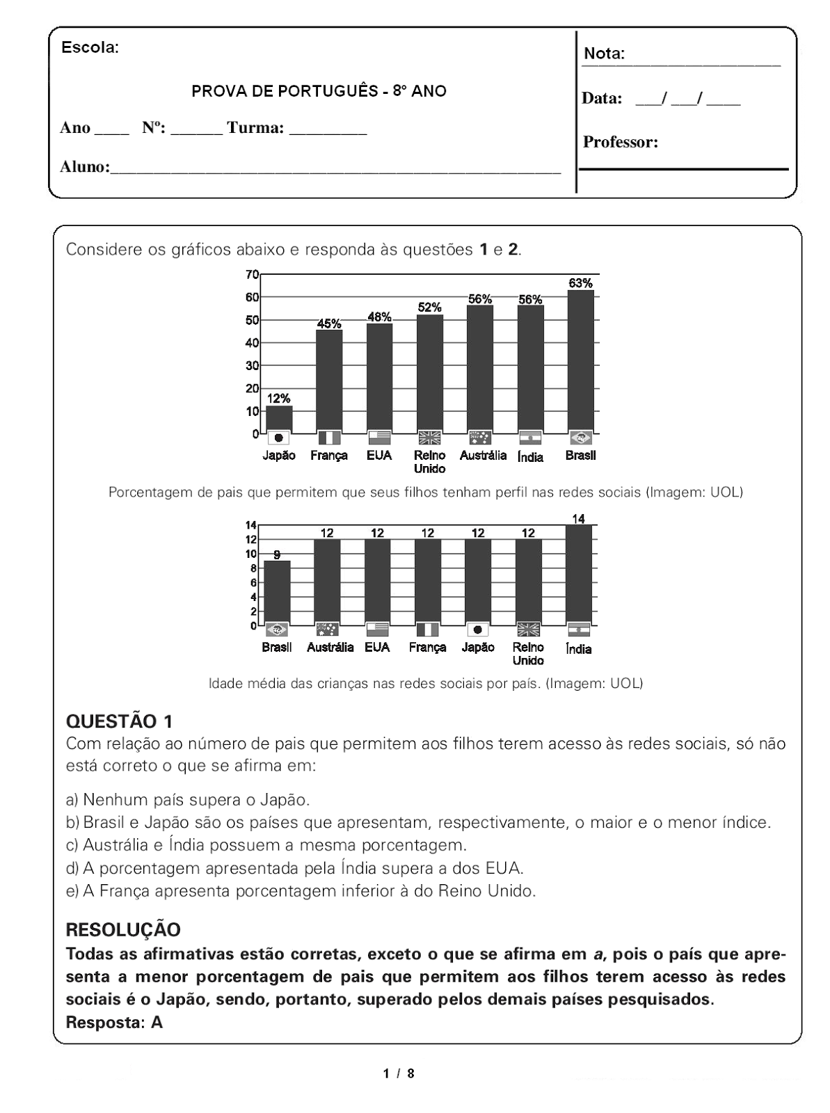 ATIVIDADES LÍNGUA PORTUGUESA 8° ANO EXERCÍCIOS PROVAS AVALIAÇÕES (VII) Língua Portuguesa 8° ano