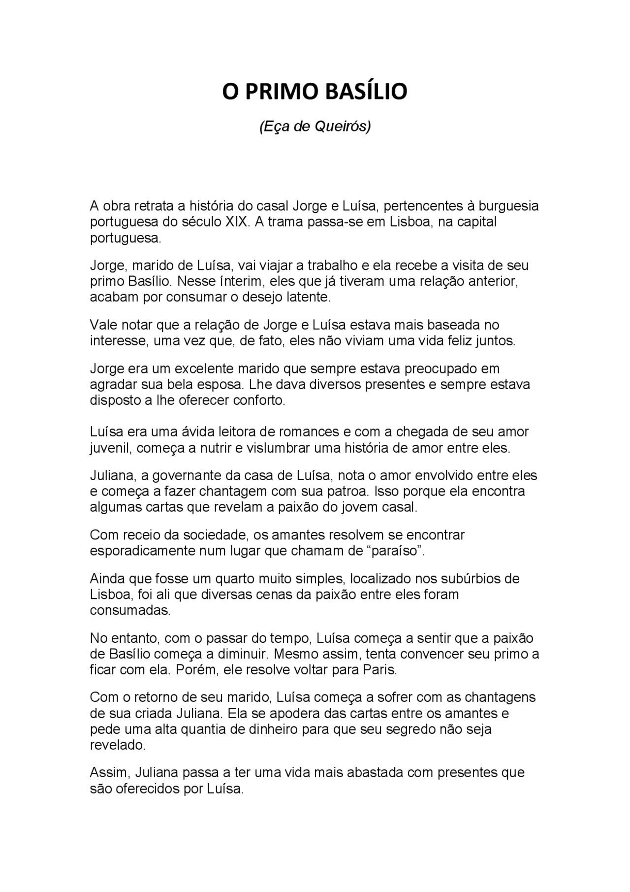 Projeto ENEM. Resenha crítica do clássico da literatura O Primo Basílio, de Eça de Queiroz.Sinopse: Durante uma viagem prolongada de seu marido, Luísa se dei.