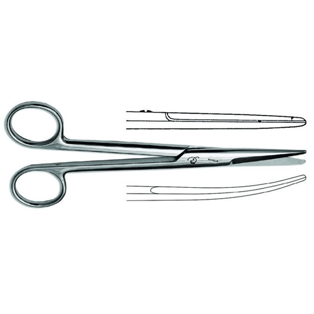 Tesoura Mayo. As tesouras Mayo possuem as pontas semi-rombas e são normalmente utilizadas para cortar tecidos corporais à volta da superfície da ferida e suturas. Lâmina reta: são projetados para cortar os tecidos do corpo próximos à superfície de uma ferida. Também são utilizadas para o corte de suturas. Lâmina curva permite a.